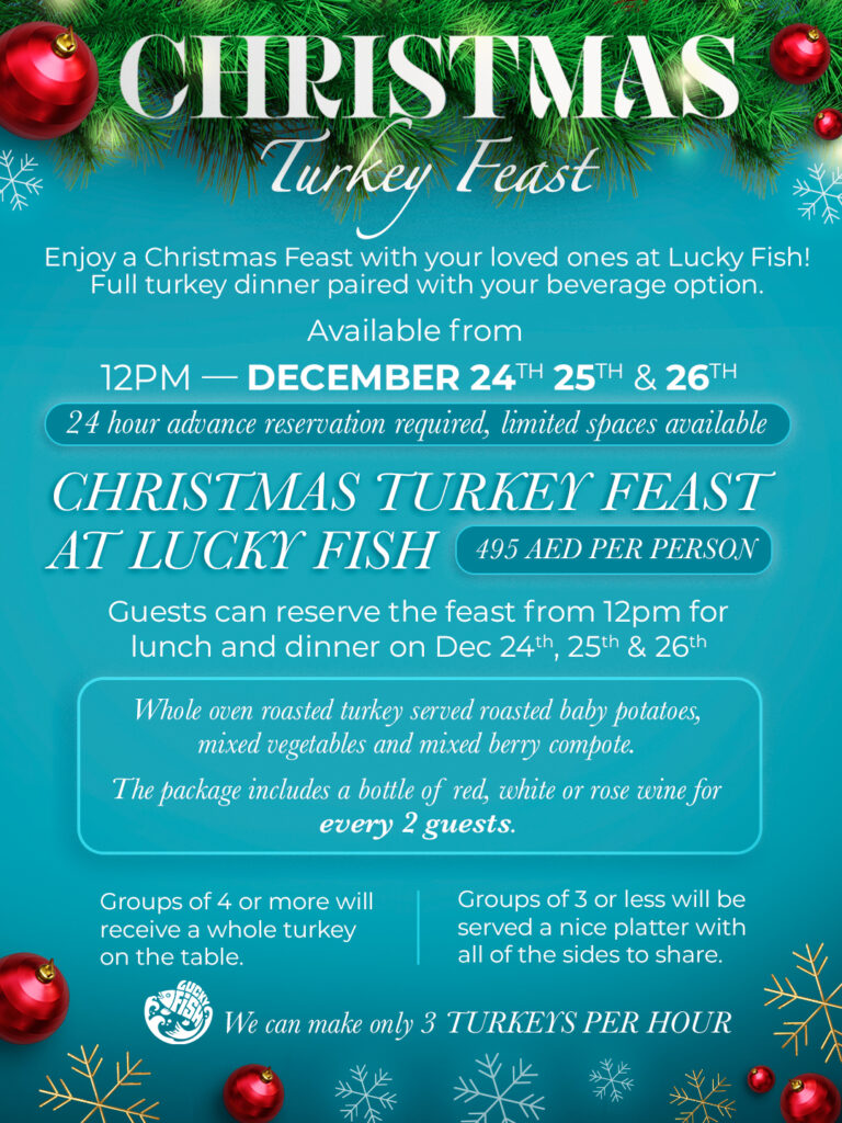 Experience a coastal Christmas celebration like no other as Lucky Fish transforms into a beachfront winter wonderland on Palm West Beach all for just AED 495 per person.