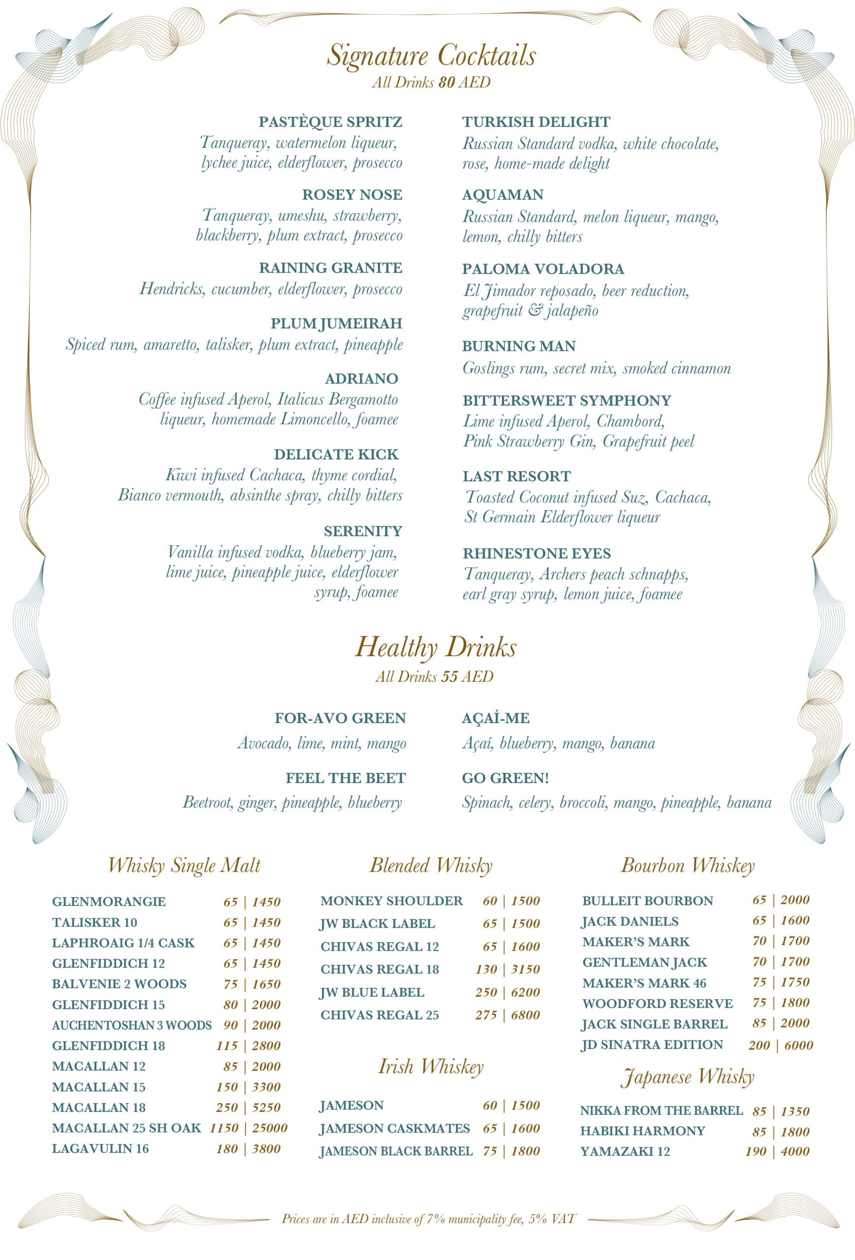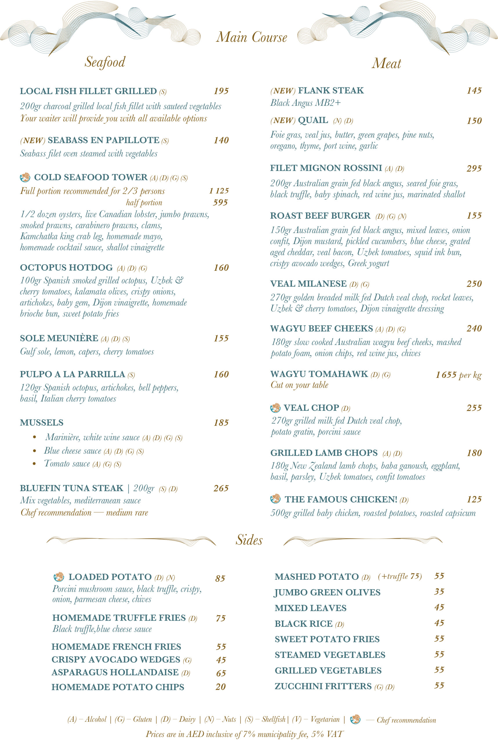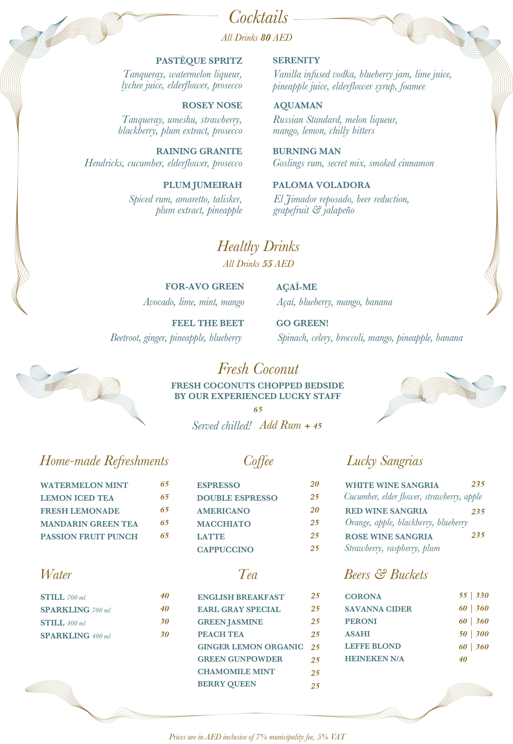Menu Breakfast Main Food beach Food Bottle sales beach Coctails desserts drinks and wine contact [email protected] +971 4 569 34 47 Feedback