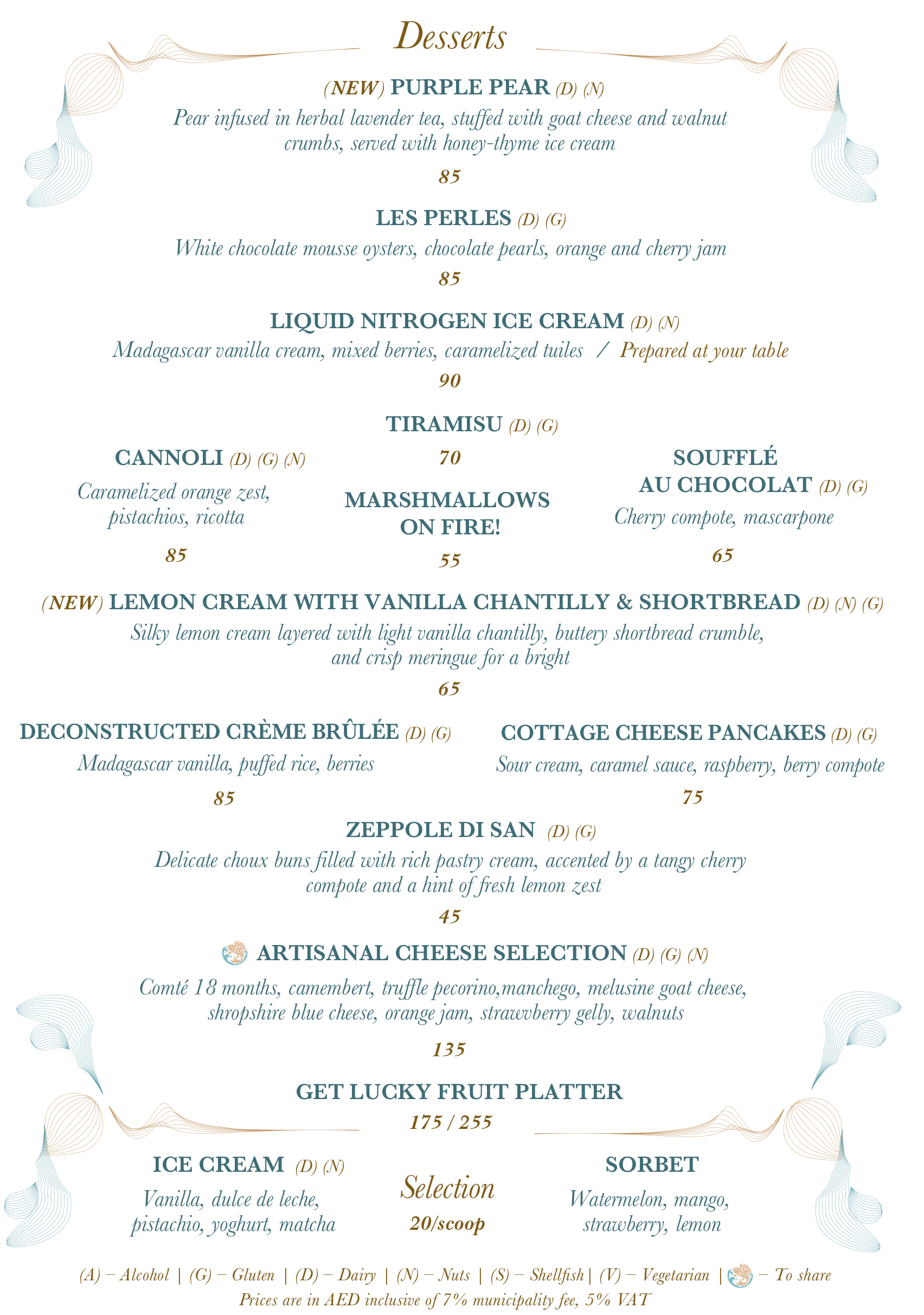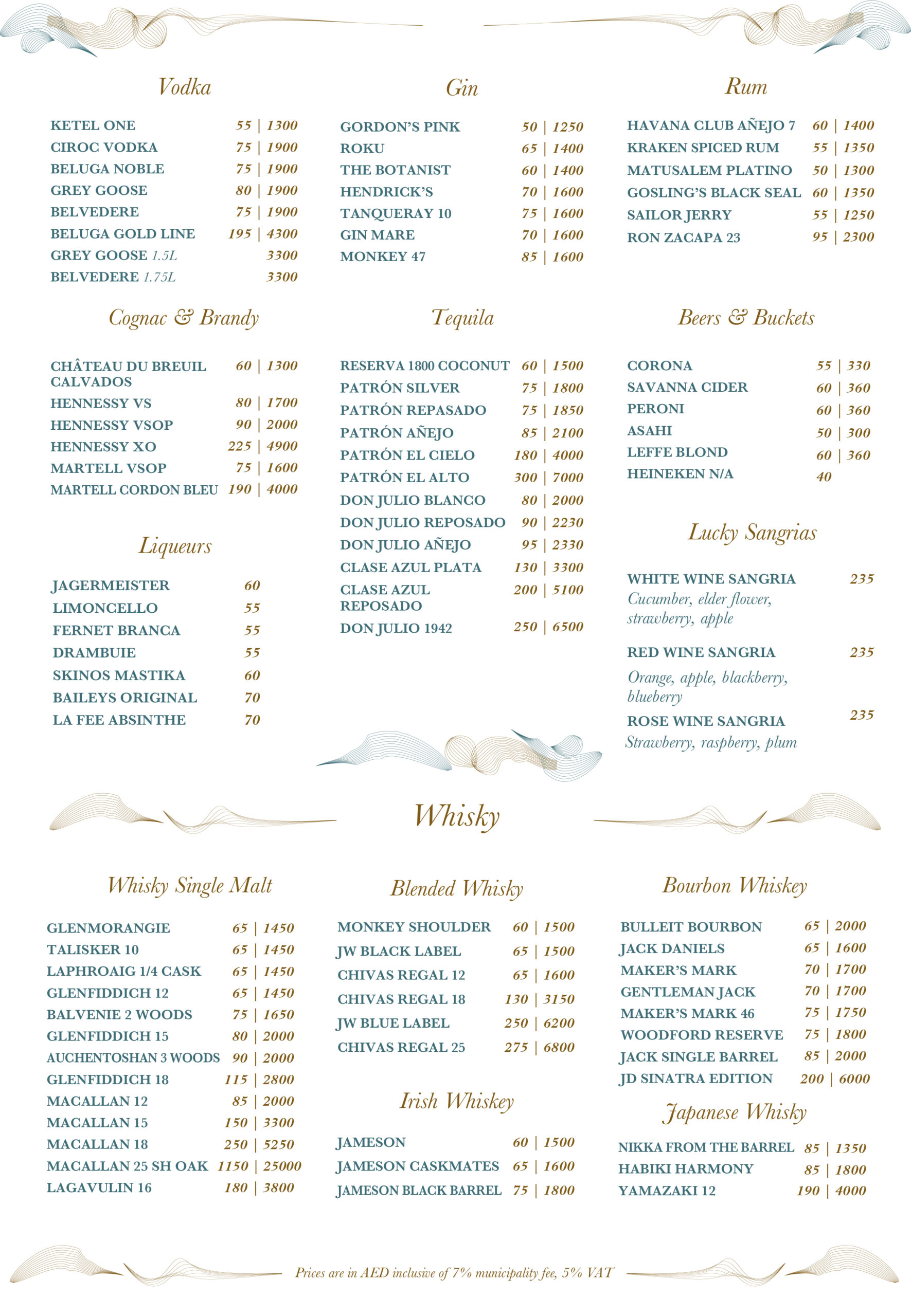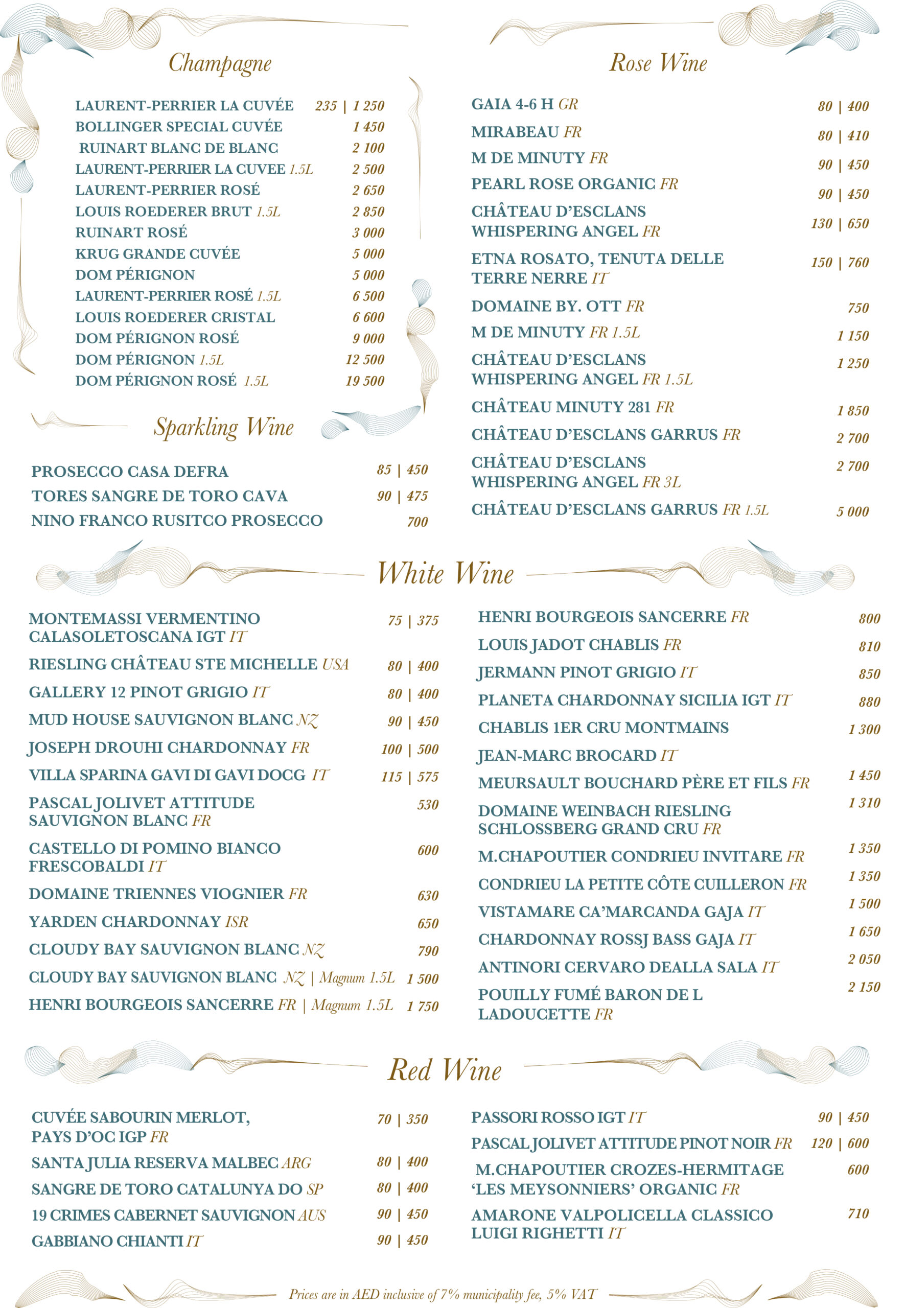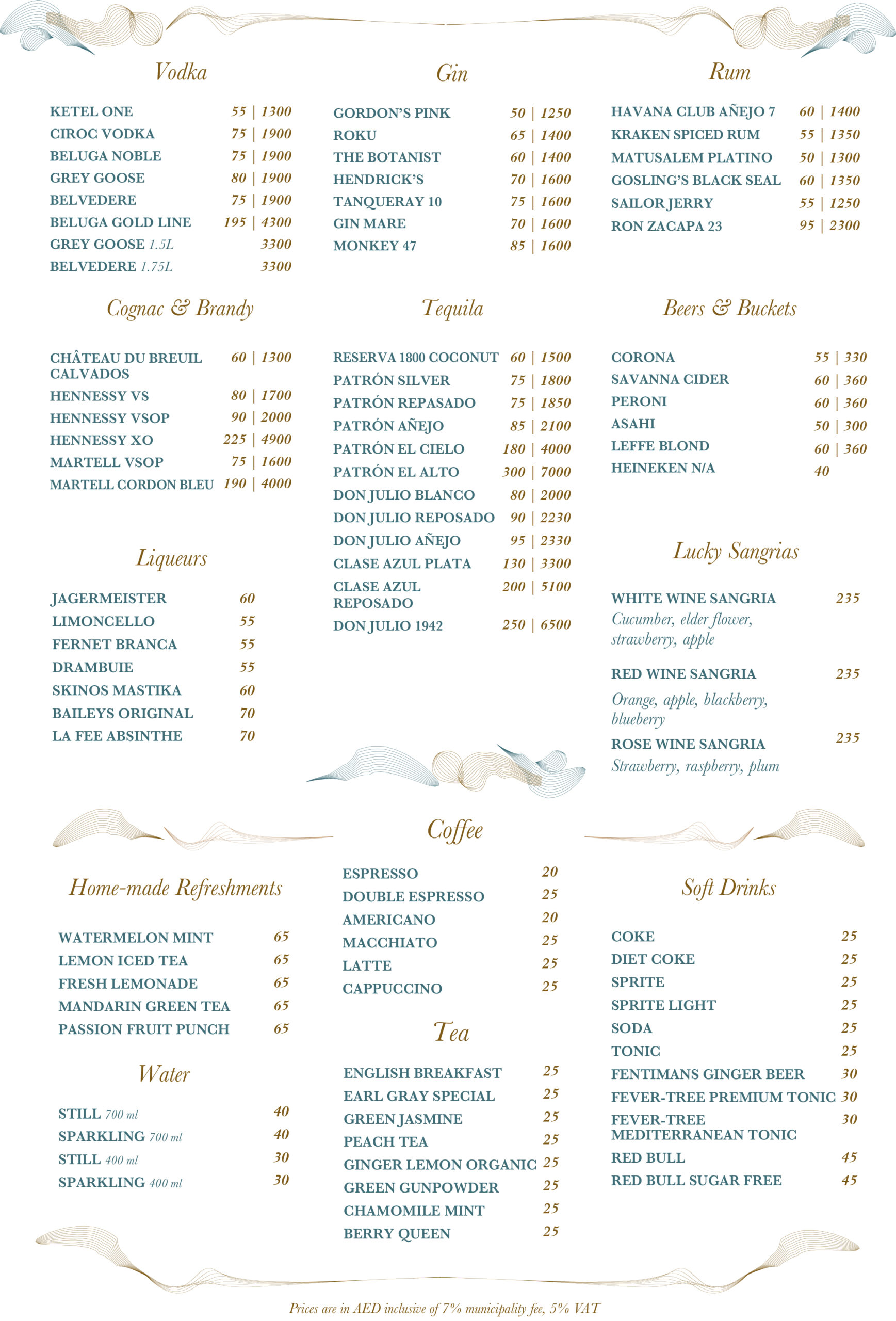Menu Breakfast Main Food beach Food Bottle sales beach Coctails desserts drinks and wine contact [email protected] +971 4 569 34 47 Feedback
